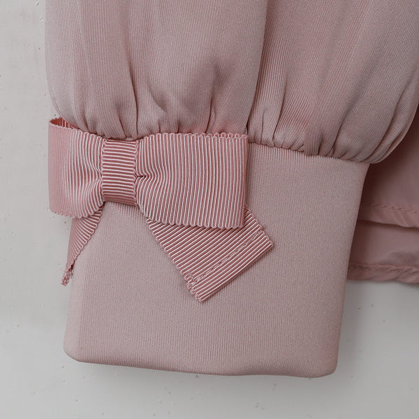 袖口にはさりげなくリボンモチーフを施し、シンプルな中にもフェミニンなアクセントをプラス。