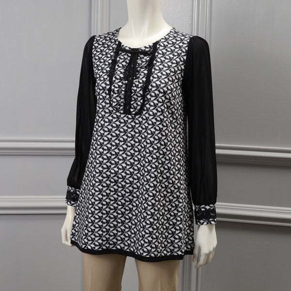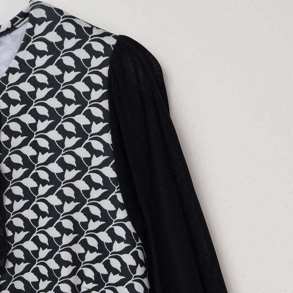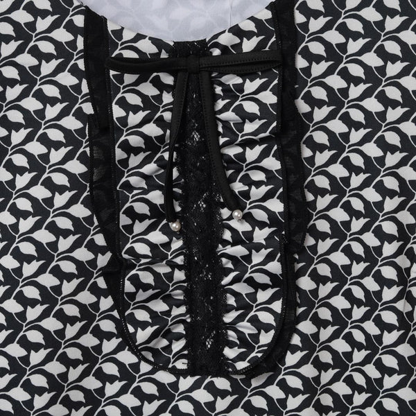 胸元のフリルと襟元のリボンモチーフが、洗練された印象を持たせてくれます。