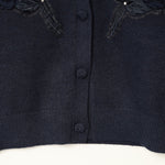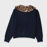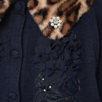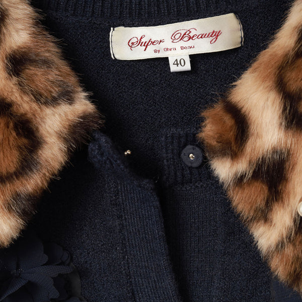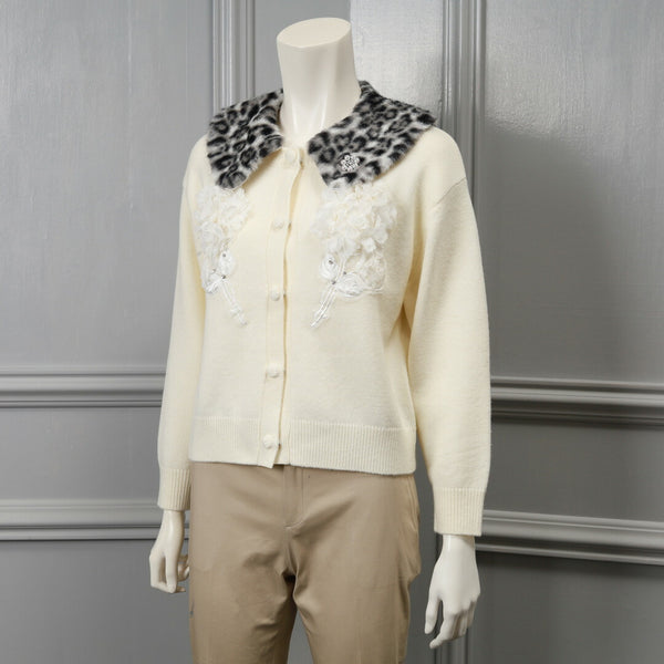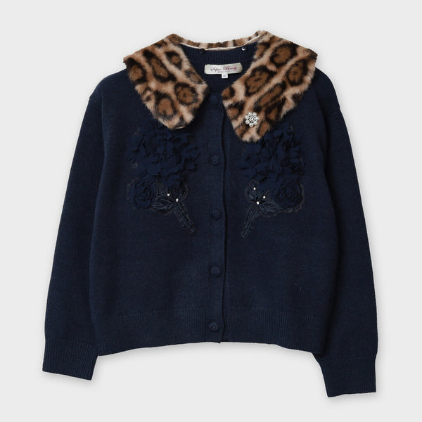胸元刺しゅう入りアニマルファー襟ニットカーディガン