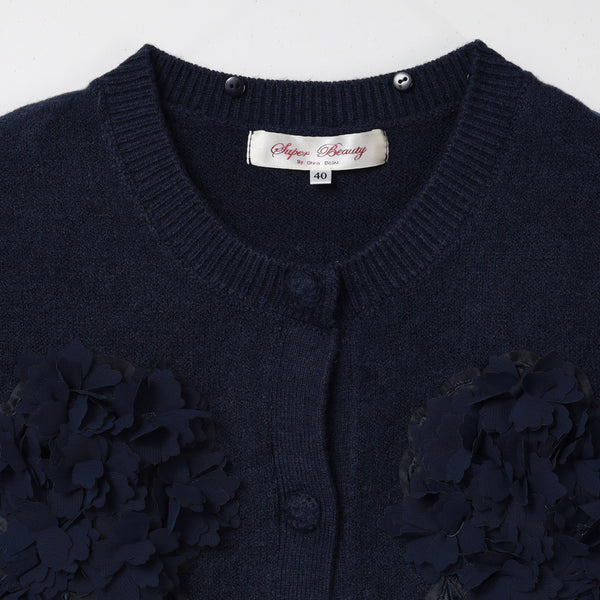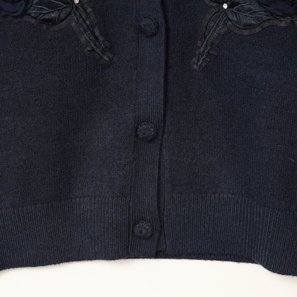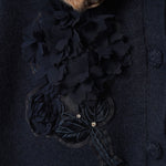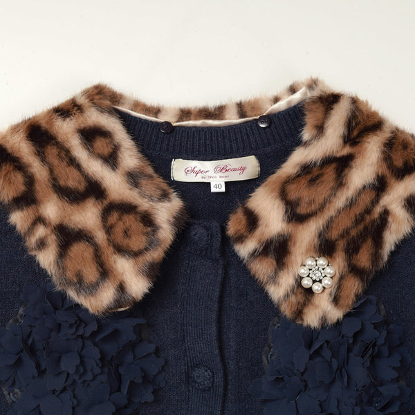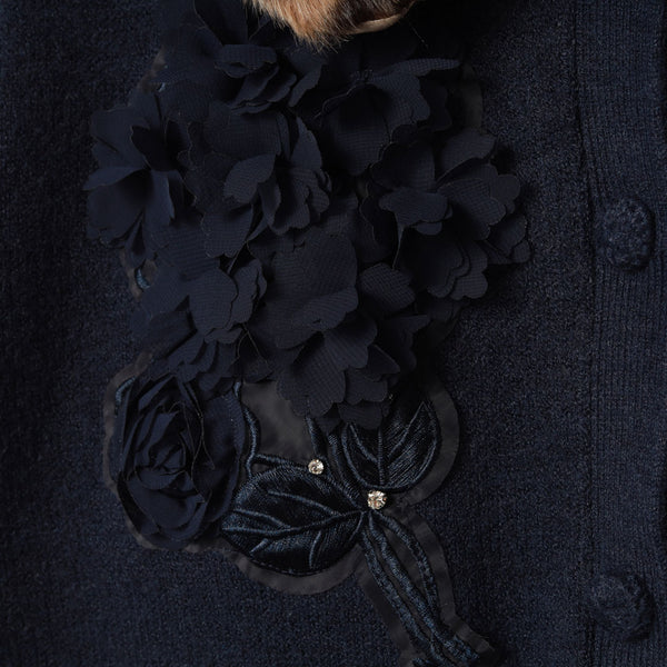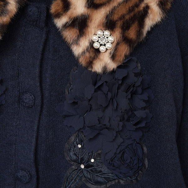 胸元立体花モチーフ 刺しゅう入りアニマルファー襟ニットカーディガンです。