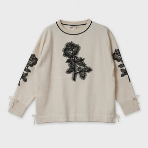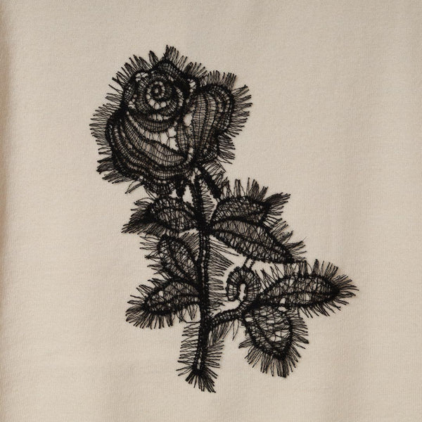 胸元と袖には華やかな花レースが施され、エレガントな印象を与えます。