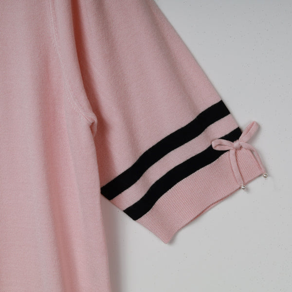 袖口に施された二本ラインと小さなリボンが、さりげないアクセントとなり、細部へのこだわりを感じさせます。