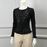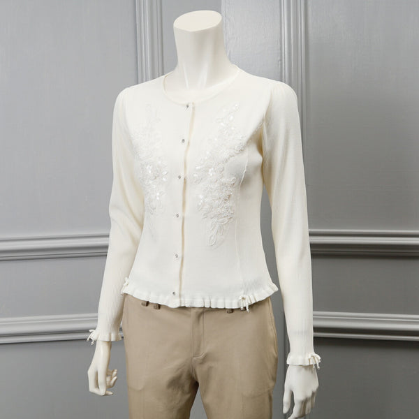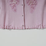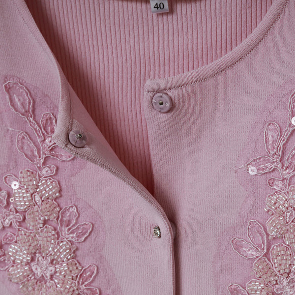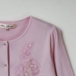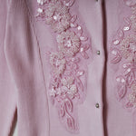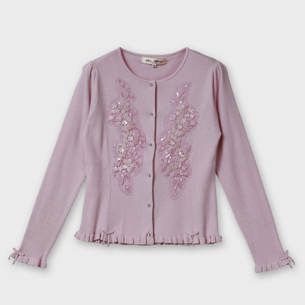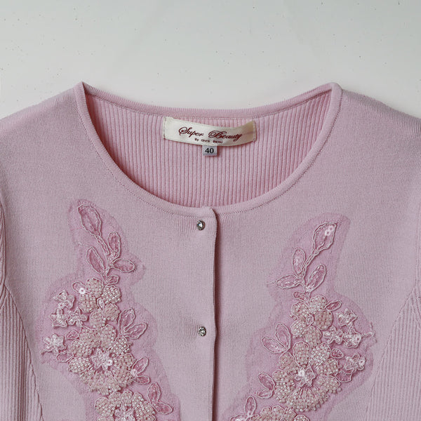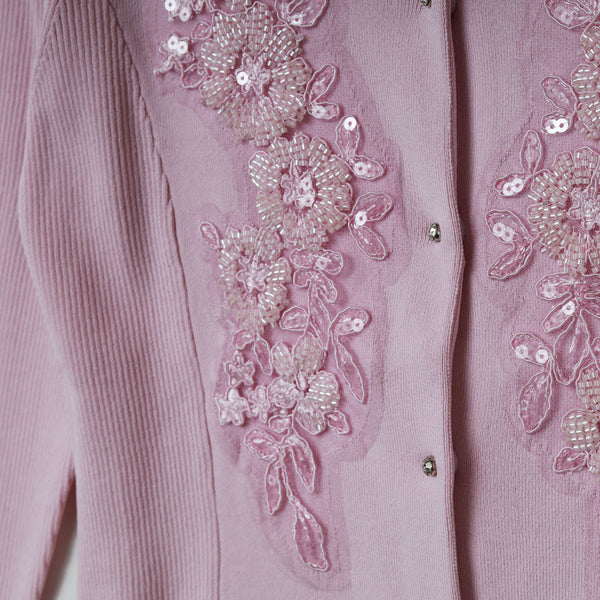 繊細な花刺繍と上品なビーズ装飾が目を引く、エレガントなカーディガンです。